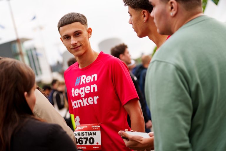 - Schrijf je in via KWF. Haal voor 8 mei 2025 minimaal 500 euro op en KWF beloont je met een gratis startbewijs én het Ren tegen kanker-shirt.